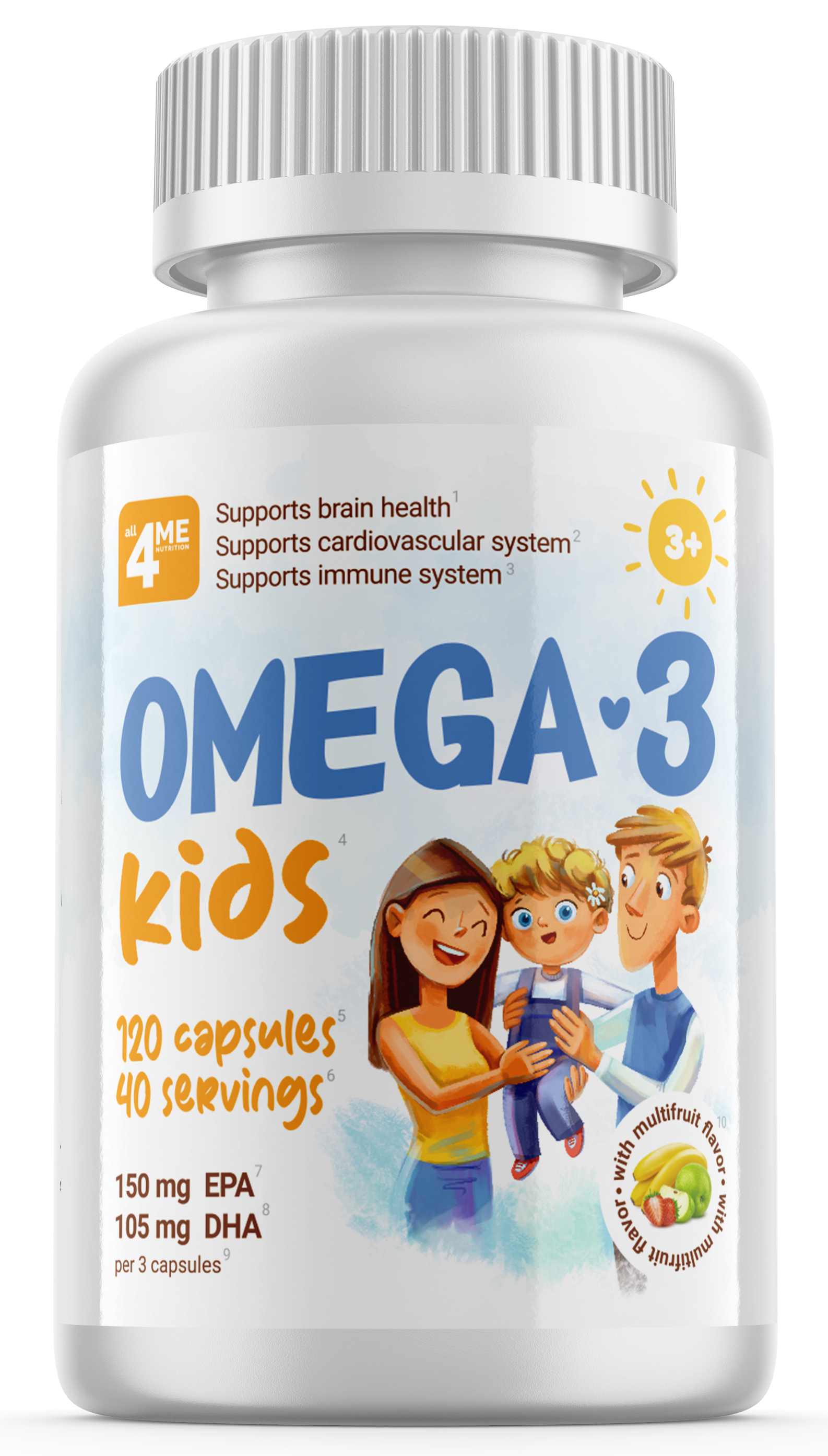 OMEGA-3 KIDS от all4ME Nutrition - это источник незаменимых полиненасыщенных жирных кислот омега-3 из рыбьего жира, в капсулах с приятным вкусом для детей от 3 лет и взрослых.