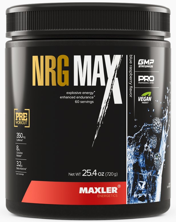 NRG MAX ? это предтренировочный комплекс от немецкой компании Maxler. Добавка предназначена для повышения выносливости, производительности, силы и концентрации на тренировках. Главными стимулирующими веществами являются кофеин, таурин, родиола розовая и эктракт черного перца. Помимо стимуляторов, в состав препарата также входит креатин и комплекс аминокислот. Добавку можно принимать как в период набора массы, так и на сушке.