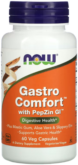 Gastro Comfort от NOW разработан для поддержания здоровья слизистой желудка. Gastro Comfort содержит клинически протестированный ингредиент PepZin GI, представляющий собой запатентованный комплекс цинка и карнозина, который, как было доказано, поддерживает целостность слизистой желудка, стимулируя естественные процессы заживления. В состав Gastro Comfort также включена мастиковая камедь, смола мастикового дерева, которая традиционно использовалась для поддержания здоровья пищеварительной системы. Вяз ржавый и алоэ вера, входящие в состав этого продукта, также способствуют поддержанию здорового процесса пищеварения.