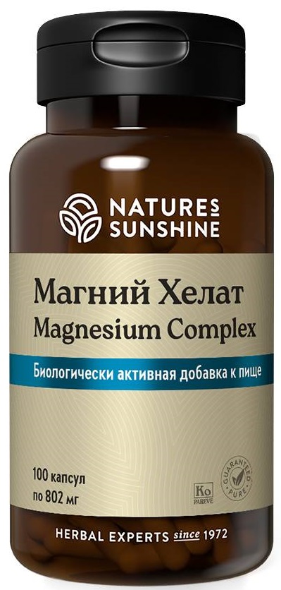 Магний – один из наиболее важных биоэлементов, в значительных количествах содержится в тканях животных и растений (хлорофилл). Магний – важнейший электролит, он является кофактором многих ферментативных реакций. Магний участвует в превращении креатинфосфата в АТФ, необходим на всех этапах синтеза белка. О дефиците магния свидетельствуют: нарушения сна, повышенная раздражительность, необъяснимая тревога, повышенная утомляемостью, спазмы икроножных мышц, у детей – синдром гиперактивности. В более тяжелых случаях отмечают повышенную подверженность стрессам, нарушение сердечного ритма, запоры, осложнение предменструального синдрома. Потребность в магнии увеличивается при потливости, частом употреблении слабительных и мочегонных, алкоголя, при больших психических и физических нагрузках (в первую очередь при стрессах и у спортсменов). В каждой капсуле БАД Магний Хелат содержится 100 мг чистого магния, который находится в хелатном соединении с органическими кислотами яблочной и лимонной кислотой, что обеспечивает максимальное усвоение этого макроэлемента.