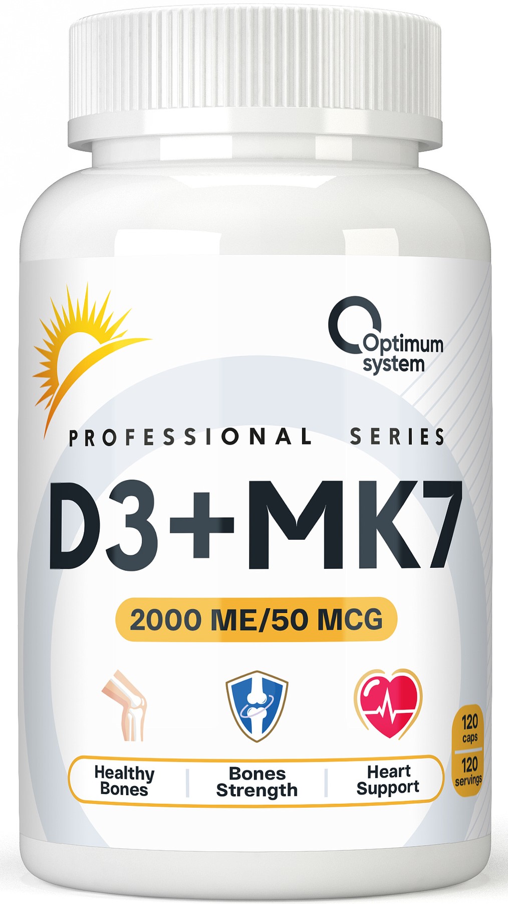Optimum System Vitamin D3 2000 + К2 МК-7 — это биологически активная добавка, которая содержит витамин D3 и витамин К2 в форме МК-7. Витамин D3 способствует усвоению кальция и фосфора, поддерживает здоровье костей и иммунной системы. Витамин К2 помогает направить кальций в костную ткань, предотвращая его отложение в мягких тканях и сосудах.
