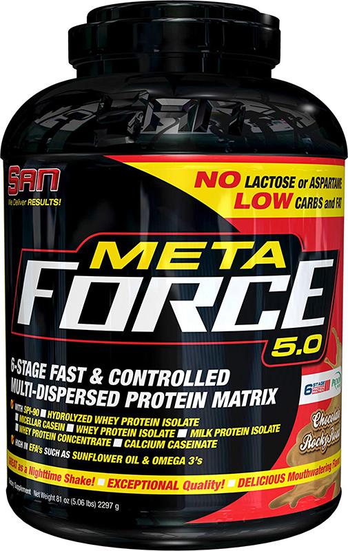 Многокомпонентный протеин Meta Force от компании SAN ? это продукт, в основу которого положена 6-ступенчатая мульти-дисперсная белковая матрица, состоящая из таких источников протеина, как гидролизованный изолят сывороточного белка, SPI-90, микрофильтрованный концентрат сывороточного протеина, мицеллярный казеин, изолят сывороточного протеина, изолят и концентрат молочного протеина, а также казеинат кальция. Особенностью данного продукта заключается в высоком содержании незаменимых жирных кислот, источниками которых служат масло подсолнуха и омега-3.