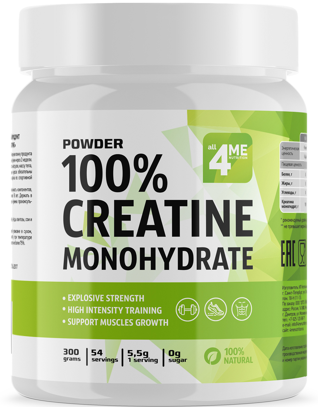 CREATINE MONOHYDRATE от ALL4ME NUTRITION - это 100% креатин моногидрат в виде порошка без вкусовых добавок.