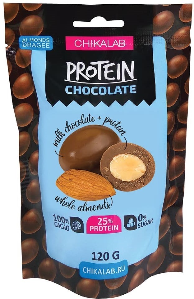 Протеиновое драже - это: орех внутри; нежный тающий корпус, сделанный на основе протеина; шоколадная глазурь.